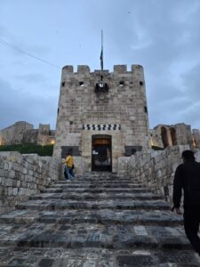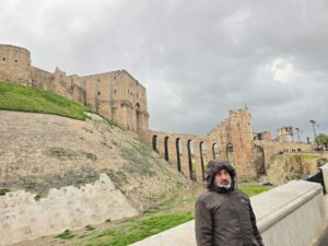 • Halep Kalesi ve Savunma Hendekleri: Kalenin heybetli duruşu ve savaş sırasında birer siper (hendek) olarak kullanılan boşlukların, tarihin en eski savunma yapılarından birini nasıl modern bir çatışma alanına dönüştürdüğünü ayrıca tefekkür ettik. Kalenin çevresinde derin boşluk vardı ve bu boşluk üzerinde kaleye giren bir köprü bulunuyordu. Bu boşluklar savaş döneminde su bırakılarak savunma güçlendiriliyordu. Kaleyi görmemiz bize tüm tarihi hatırlattı. Çünkü bu kale burada yaşananların tek tanığıydı.